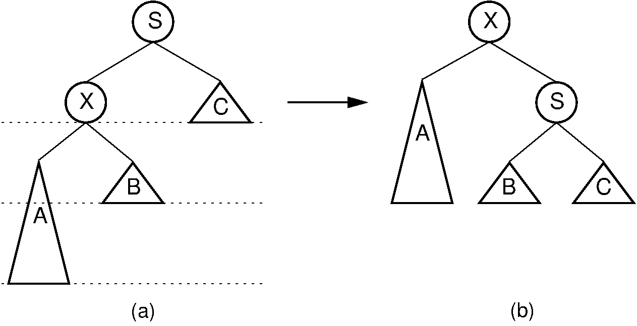 Figure 7.2.2: A single rotation in an AVL tree. This operation occurs when the excess node (in subtree \(A\)) is in the left child of the left child of the unbalanced node labeled \(S\). By rearranging the nodes as shown, we preserve the BST property, as well as re-balance the tree to preserve the AVL tree balance property. The case where the excess node is in the right child of the right child of the unbalanced node is handled in the same way.