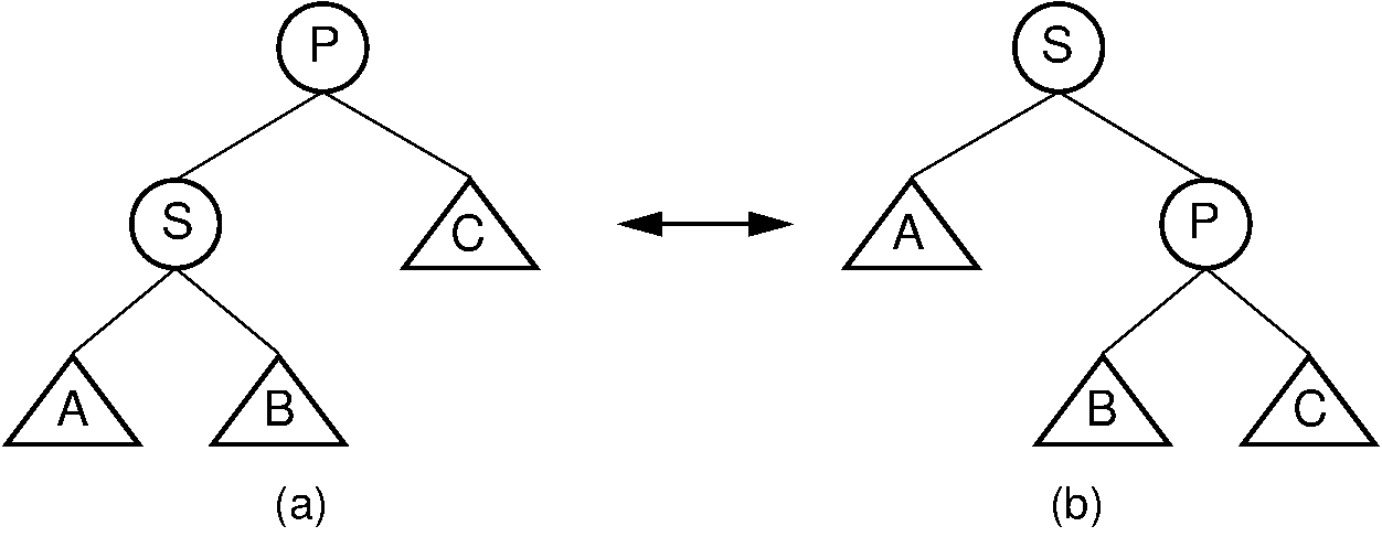Figure 7.3.1: Splay tree single rotation. This rotation takes place only when the node being splayed is a child of the root. Here, node \(S\) is promoted to the root, rotating with node \(P\). Because the value of \(S\) is less than the value of \(P\), \(P\) must become \(S\) ‘s right child. The positions of subtrees \(A\), \(B\), and ;math:C are altered as appropriate to maintain the BST property, but the contents of these subtrees remains unchanged. (a) The original tree with \(P\) as the parent. (b) The tree after a rotation takes place. Performing a single rotation a second time will return the tree to its original shape. Equivalently, if (b) is the initial configuration of the tree (i.e., \(S\) is at the root and \(P\) is its right child), then (a) shows the result of a single rotation to splay \(P\) to the root.