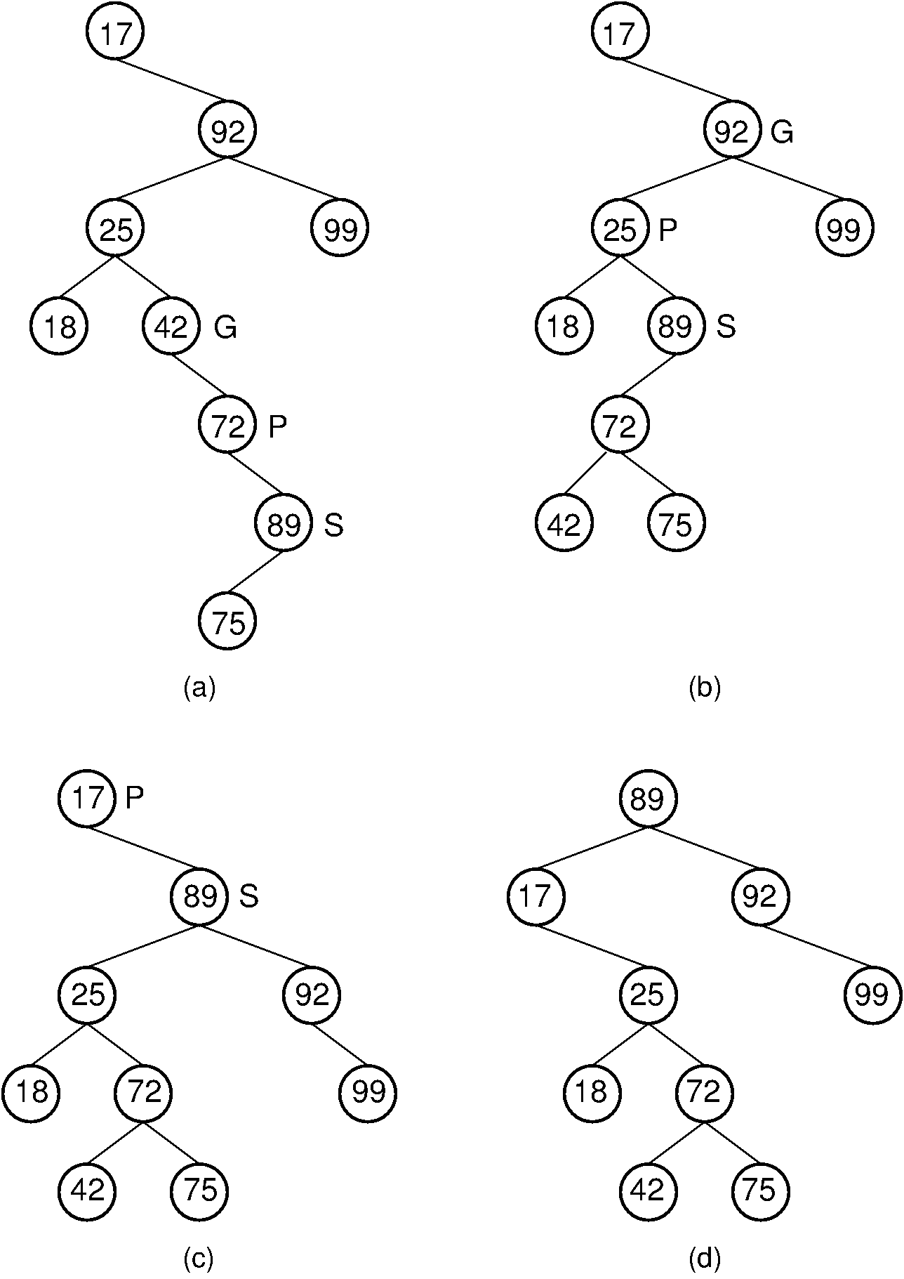 Figure 7.3.4: Example of splaying after performing a search in a splay tree. After finding the node with key value 89, that node is splayed to the root by performing three rotations. (a) The original splay tree. (b) The result of performing a zigzig rotation on the node with key value 89 in the tree of (a). (c) The result of performing a zigzag rotation on the node with key value 89 in the tree of (b). (d) The result of performing a single rotation on the node with key value 89 in the tree of (c). If the search had been for 91, the search would have been unsuccessful with the node storing key value 89 being that last one visited. In that case, the same splay operations would take place.