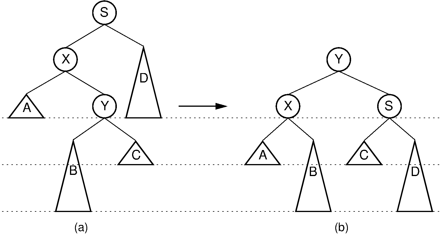 Our problem now is how to balance the tree in \(O(\log n)\) time. It turns out that we can do this using a series of local operations known as rotations. Cases 1 and 4 can be fixed using a single rotation, as shown in Figure 7.2.2. Cases 2 and 3 can be fixed using a double rotation, as shown in Figure 7.2.3.