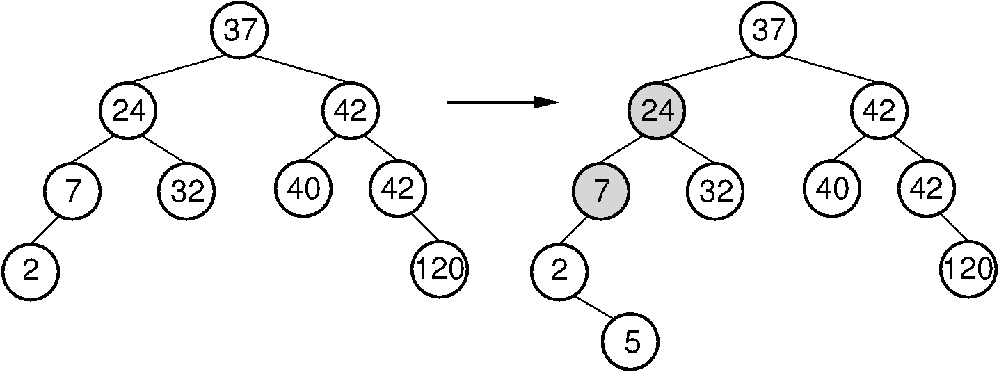 Figure 7.2.1: Example of an insert operation that violates the AVL tree balance property. Prior to the insert operation, all nodes of the tree are balanced (i.e., the depths of the left and right subtrees for every node differ by at most one). After inserting the node with value 5, the nodes with values 7 and 24 are no longer balanced.