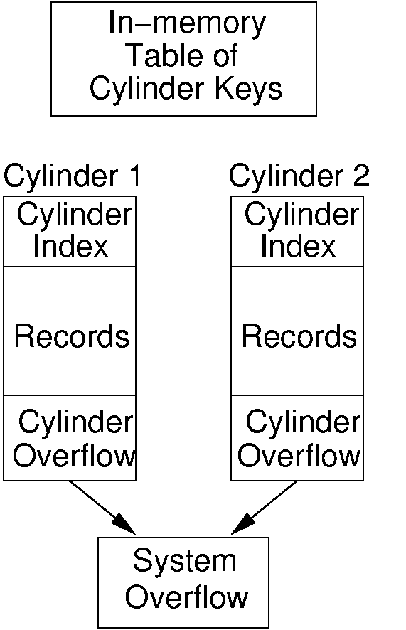ISAM is based on a modified form of the linear index, as illustrated by Figure 9.3.1. Records are stored in sorted order by primary key. The disk file is divided among a number of cylinders on disk. Each cylinder holds a section of the list in sorted order. Initially, each cylinder is not filled to capacity, and the extra space is set aside in the cylinder overflow. In memory is a table listing the lowest key value stored in each cylinder of the file. Each cylinder contains a table listing the lowest key value for each block in that cylinder, called the cylinder index. When new records are inserted, they are placed in the correct cylinder’s overflow area (in effect, a cylinder acts as a bucket). If a cylinder’s overflow area fills completely, then a system-wide overflow area is used. Search proceeds by determining the proper cylinder from the system-wide table kept in main memory. The cylinder’s block table is brought in from disk and consulted to determine the correct block. If the record is found in that block, then the search is complete. Otherwise, the cylinder’s overflow area is searched. If that is full, and the record is not found, then the system-wide overflow is searched.