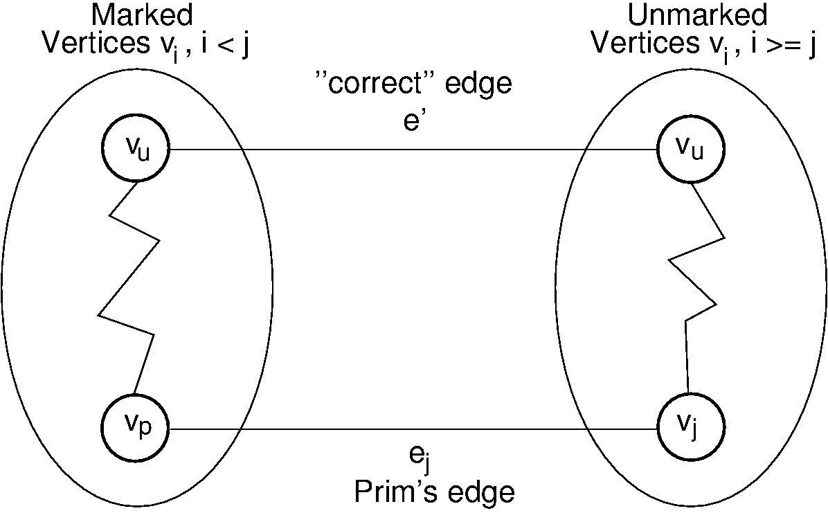 Because \(\mathbf{T}\) is a tree, there exists some path in \(\mathbf{T}\) connecting \(v_p\) and \(v_j\). There must be some edge \(e'\) in this path connecting vertices \(v_u\) and \(v_w\), with \(u < j\) and \(w \geq j\). Because \(e_j\) is not part of \(\mathbf{T}\), adding edge \(e_j\) to \(\mathbf{T}\) forms a cycle. Edge \(e'\) must be of lower cost than edge \(e_j\), because Prim’s algorithm did not generate an MCST. This situation is illustrated in Figure 11.6.2. However, Prim’s algorithm would have selected the least-cost edge available. It would have selected \(e'\), not \(e_j\). Thus, it is a contradiction that Prim’s algorithm would have selected the wrong edge, and thus, Prim’s algorithm must be correct. BOX HERE
