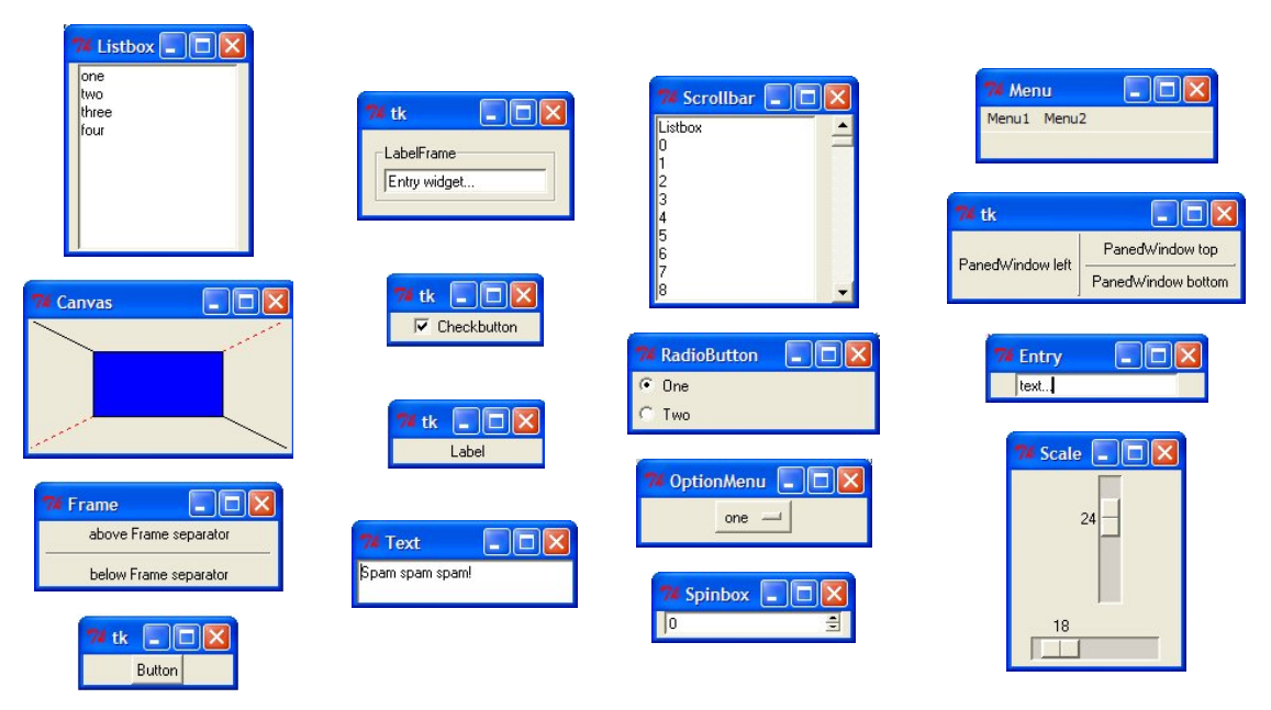 I tabellen ovan ser vi många av de widgets som finns i Tkinter. Det finns ytterligare widgets i submoduler och tilläggsmoduler, t.ex. ttk (Themed Tkinter), men de ligger utanför ramarna idag.