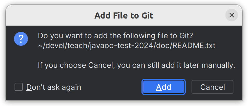 Varje gång du lägger till en fil i IDEA kommer du att få en fråga om denna fil också ska