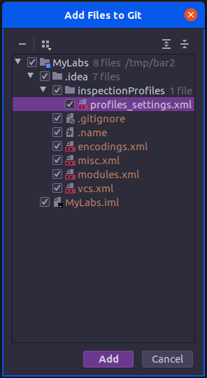 IDEAs konfiguration lagras i ett större antal olika filer i katalogen .idea. När du fortsätter använda IDEA kan fler konfigurationsfiler skapas och då kan du få en fråga om de ska läggas till i Git. De ska läggas till! Vi har redan en .gitignore som ser till att onödiga filer ignoreras.