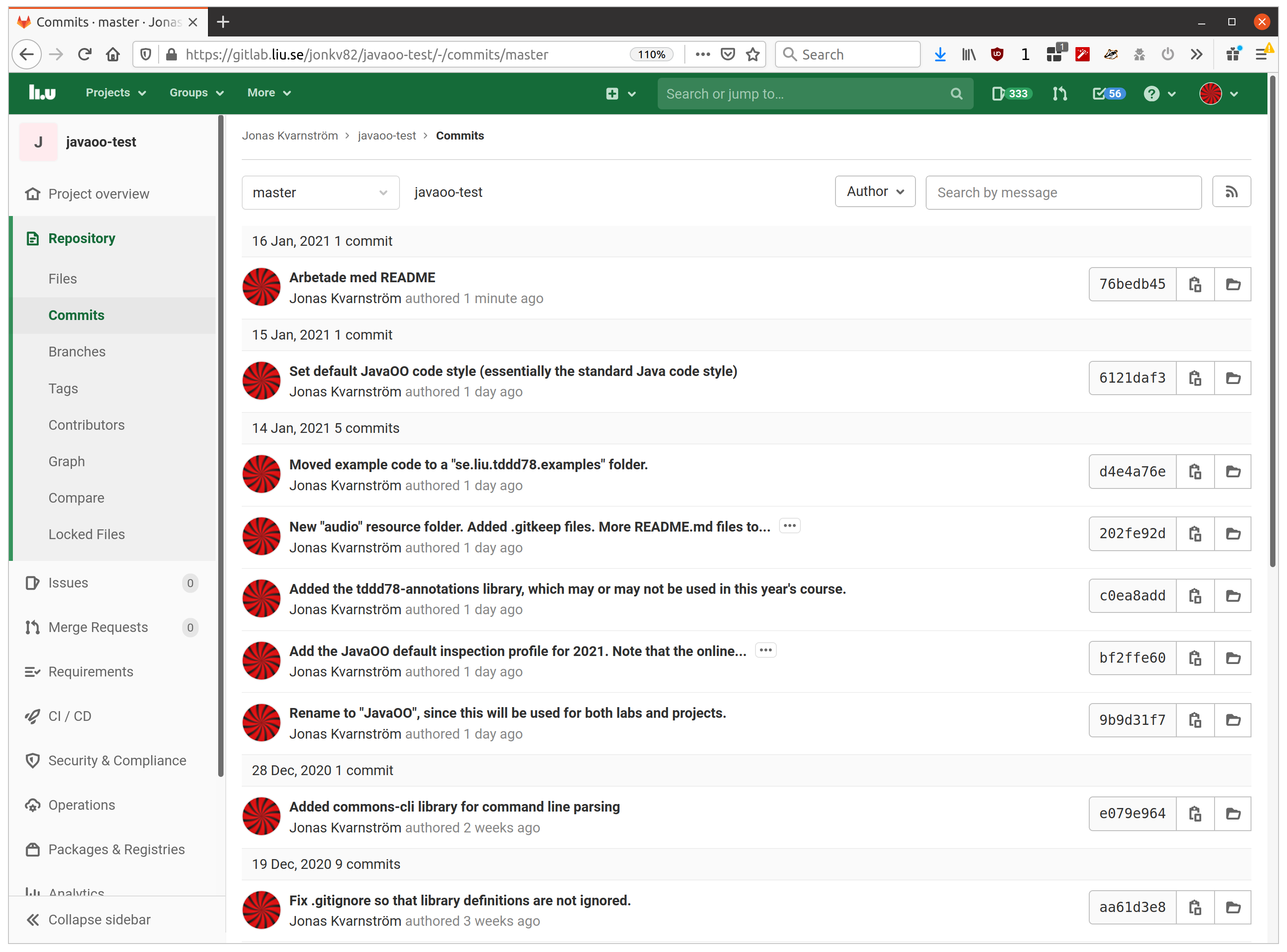 Som du ser ovan finns en del commits som inte du har gjort. Detta är de commits som har gjorts för att skapa "basen" i Gitlab-projektet så du slipper en del av arbetet med konfigureringen.