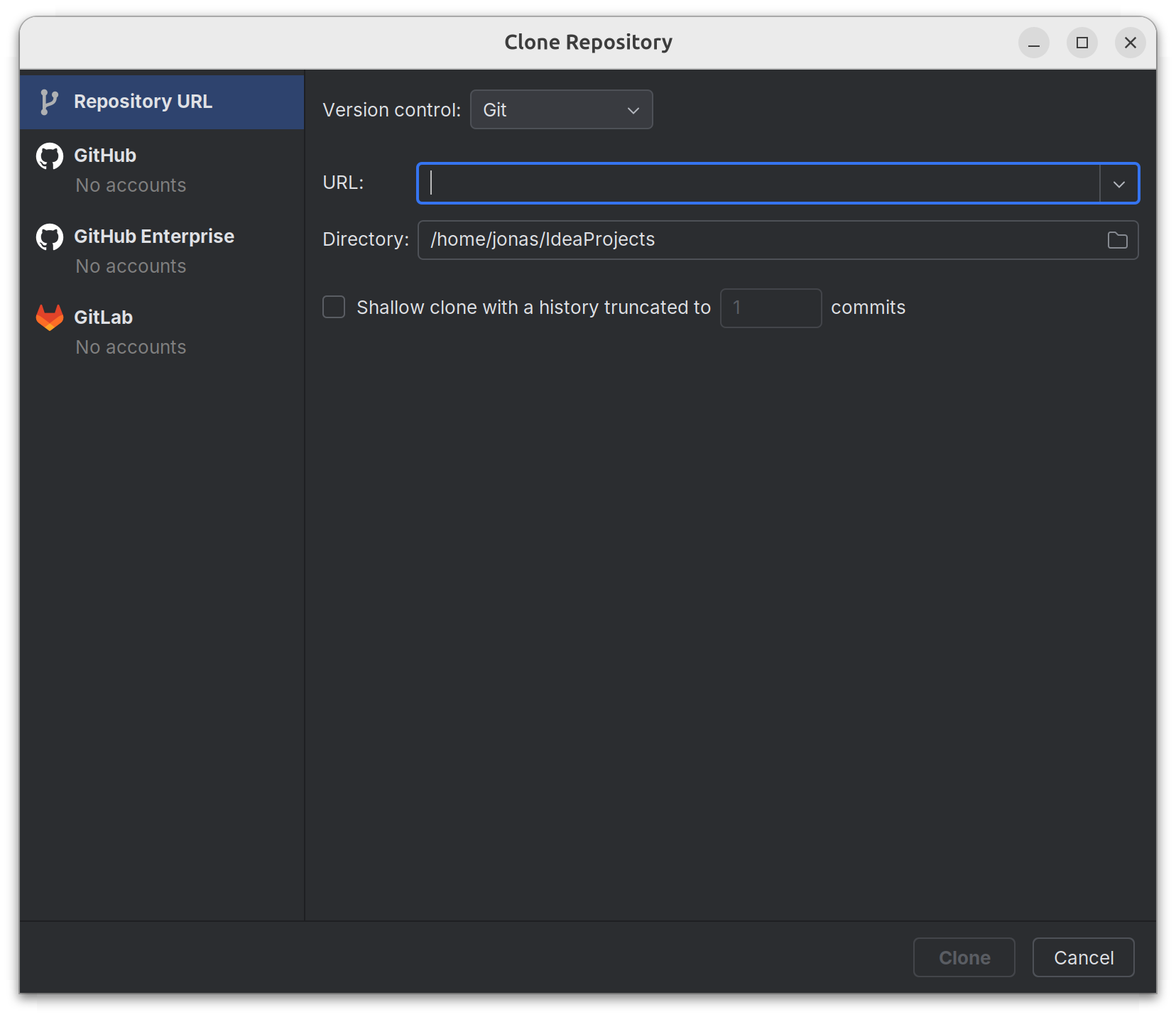 I det mindre uppstartsfönstret, som visas när inget projekt är öppet, kan man välja Projects följt av Clone Repository. Fönstret ser ut ungefär så här, men med vissa stiländringar beroende på exakt IDEA-version.