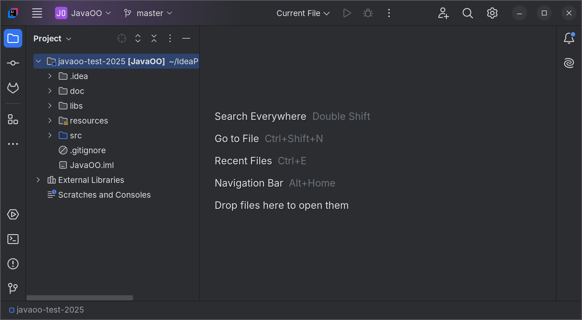 Första gången kan detta fönster vara ganska tomt, för att projektvyn är dold. Då öppnas den med Alt+1, genom att trycka på Project uppe till vänster, eller genom att välja View | Tool Windows | Project. Du kan expandera vyn över ditt projekt för att se alla relevanta mappar och filer inklusive externa bibliotek.