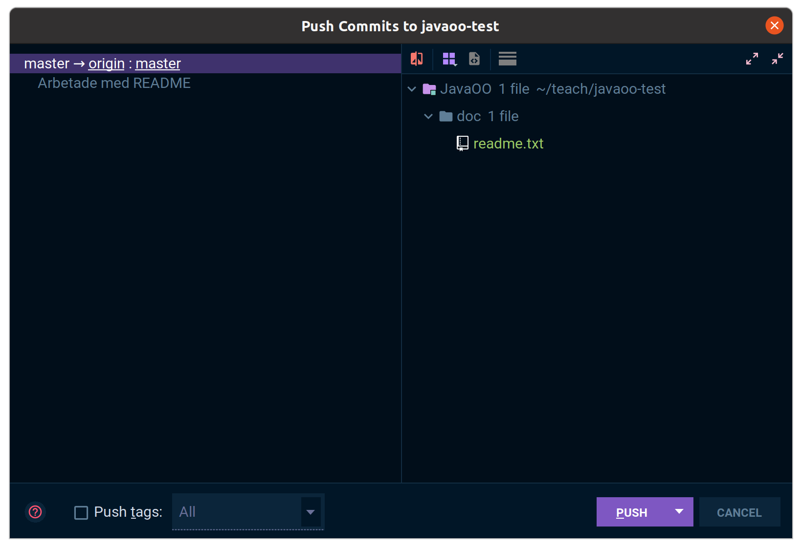 Välj VCS | Git | Push (Ctrl-Shift-K) för att ta fram dialogen för Push