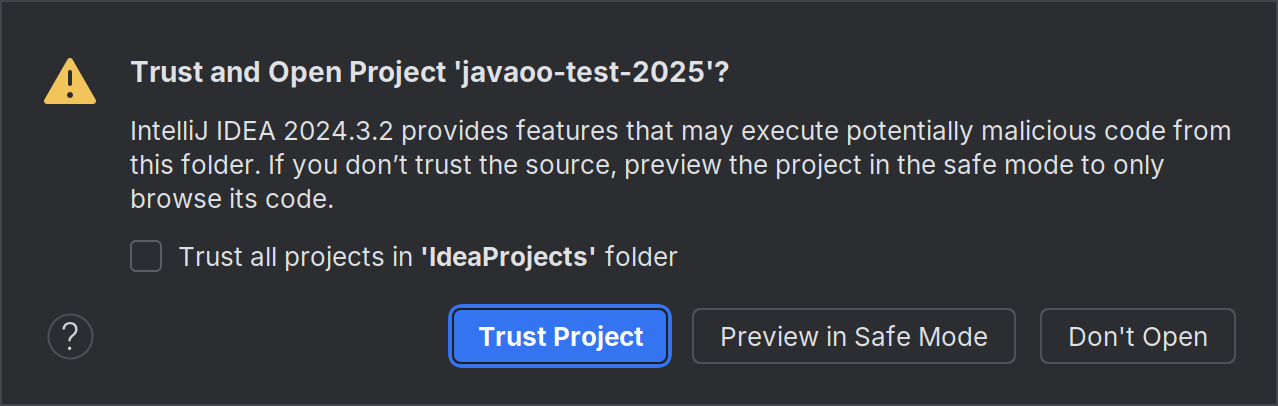 IDEA öppnar projektet. Då kan du få en fråga om du litar på projektet, vilket du kan göra i det här fallet. Se säkerhetssidorna för mer information.