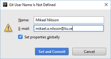 När du har klarat av ett delmoment (eller jobbat färdigt för dagen) uppdaterar du filarkivet med de ändringar du just har gjort: git commit. Detta kan du göra relativt ofta, och eftersom ändringarna bara sparas i din egna lokala klon av filarkivet kan du göra det även om du inte har tillgång till Internet. Längre ner visar vi hur detta görs inifrån IDEA!