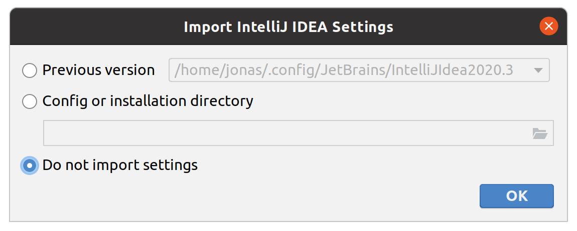 Om man har använt IDEA tidigare, men nu startar en ny version, kan IDEA fråga om du vill använda dina gamla inställningar eller starta på nytt.