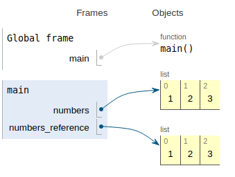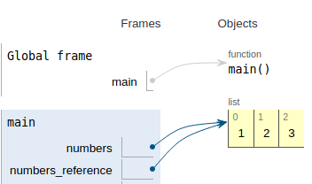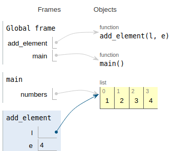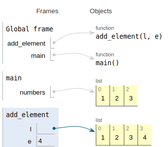 Python tutor är ett webb-baserat verktyg som låter användaren visualisera körningen av ett pythonprogram. Man kan se vilka funktioner och variabler som är definerade och i vilket scope dessa befinner sig. I denna uppgift ska ni producera program som efterliknar de givna bilderna. Ni får skriva koden lokalt eller i pythontutor men behöver visa i pythontutor att det fungerar för assistenten.